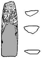 *****Three more complete adzes were found at ATIAHARA #5, these show the full range of the occupation of this site, one being an exceptionally well made (pecked) modern 3Aa and another a very ancient looking small 2Aa which is unpecked and well patinated, these I have illustrated in Diagrams 17.17 and Diagram 17.18. The Schubert team recovered a well pecked, horned 1Aa fragment as well as a very primitive unfinished 1A fragment. Both of these specimens being found from the southwest corner (see also Diagram 17.20). These fragments compare well with a another Tubuai IA adze which was found in a private collection, and has been reproduced in Diagram 17.19. One of the most important breakthroughs in the search for the origins of the Early East Polynesian Culture, will be establishing the source of the first 1A adzes. The 1A adze fragment illustrated in Diagram 17.20 may be one of Tubuai's earlier examples. (See also Volume 7, Figure 14, Adze Type 1A from the A. Viriamu Collection, another early example of a similar size.)